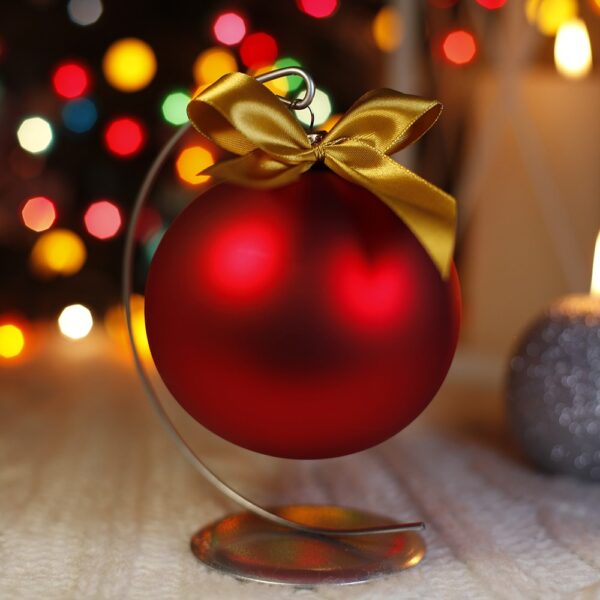 Bombka wykonana jest ze szkła, posiada metalową zawieszkę na której będziesz mógł powiesić bombkę na choince lub stojaku