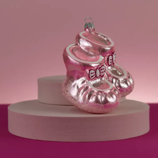 Różowy kolor i kształt bombki w formie bucików sprawiają, że ta bombka jest idealna dla małych dziewczynek, które z pewnością będą zachwycone tak uroczym prezentem. Ale to nie wszystko, ponieważ możesz wykorzystać tę bombkę jako oryginalny prezent dla młodych rodziców, którzy właśnie powitali na świecie swoją córeczkę.